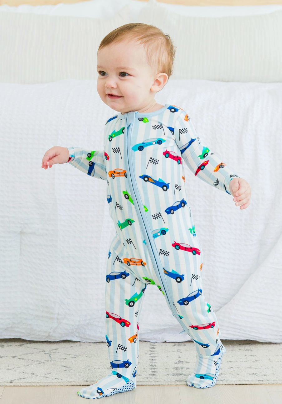Vroom vroom! Little boys will flip for this racecar print. Brightly colored sports cars speed across a racing stripe background.