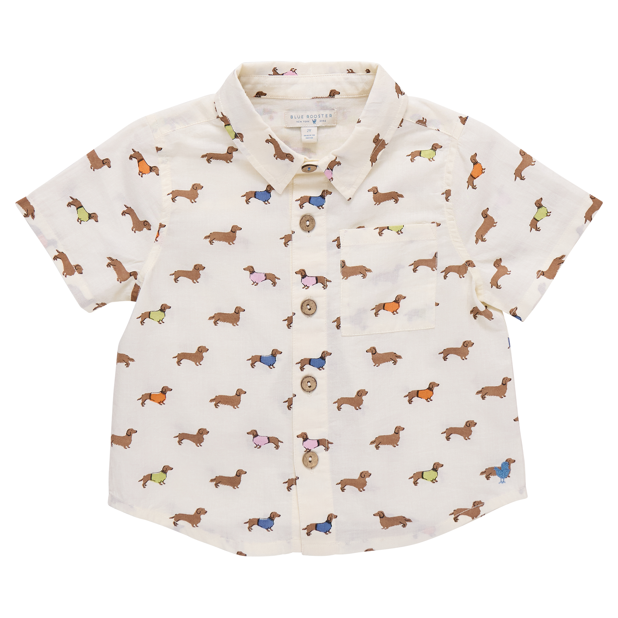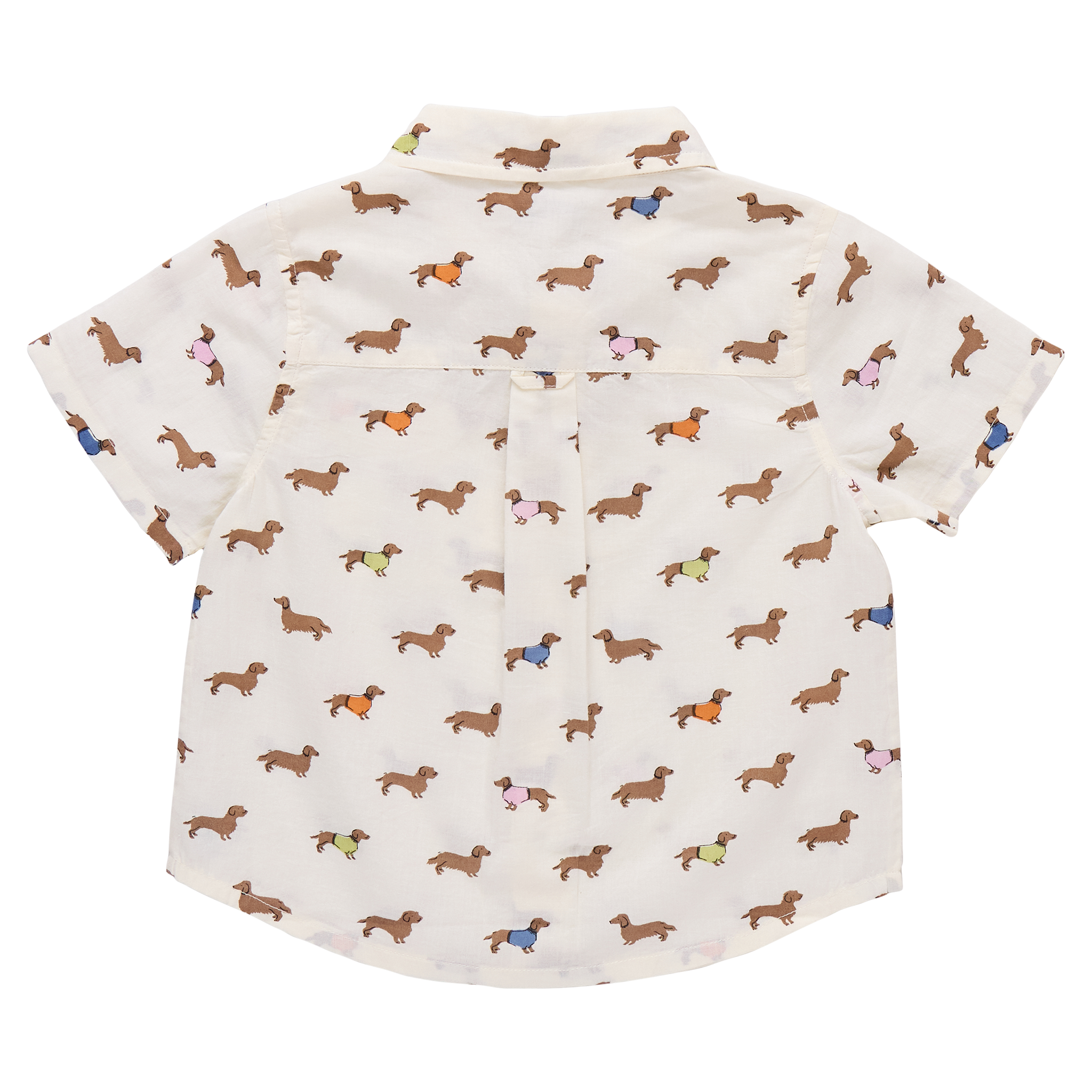 Boys button-down collared jack shirt with a fun Dachshund print on a cream ground! Features short sleeves with wooden buttons.