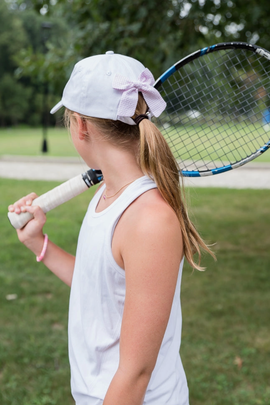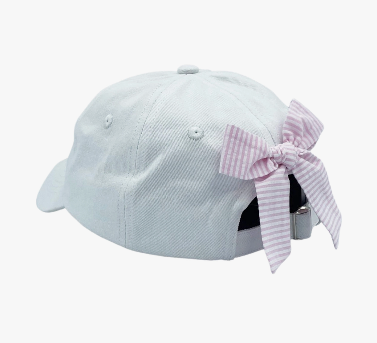 * Each Baseball Hat is adorned with a pink/white seersucker bow * Unstructured 6-panel baseball hat * Adjustable, one size fits most girls ages 2-10 (48-56cm circumference) * 100% Cotton (lightweight) * Tuck strap with adjustable slide closure