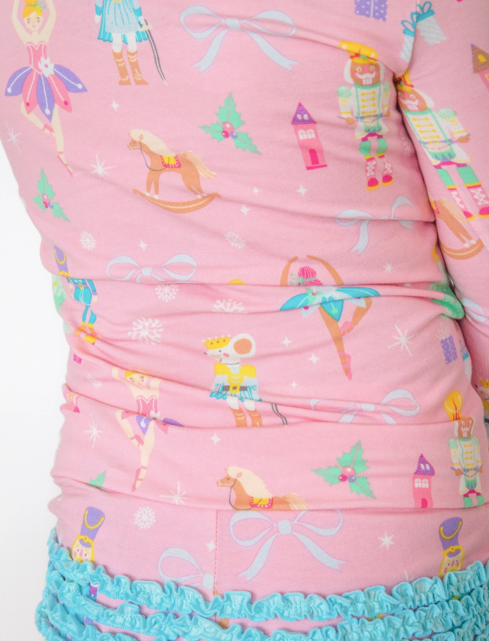 Nutcrackers, ballerinas, and toy soldiers make this candy-colored print the perfect pajama set for drifting off to dreamland. Bamboo Pajama Set with long sleeves and pants. Sizes 2-4 have ruffles on the rear, while bigger sizes do not.