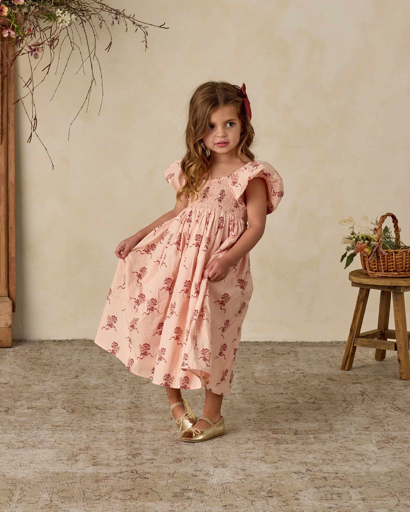 The Hazel Dress by Noralee features bubble wing sleeves, a front-smocked bodice with an empire waist, and a full midi skirt, creating an elegant and refined silhouette.