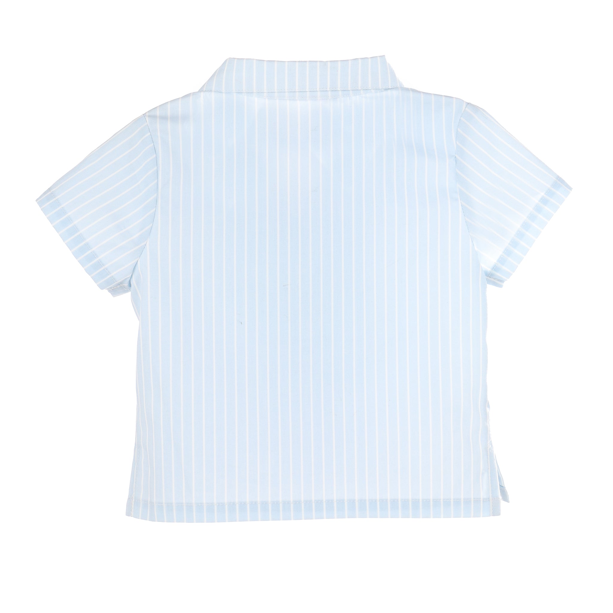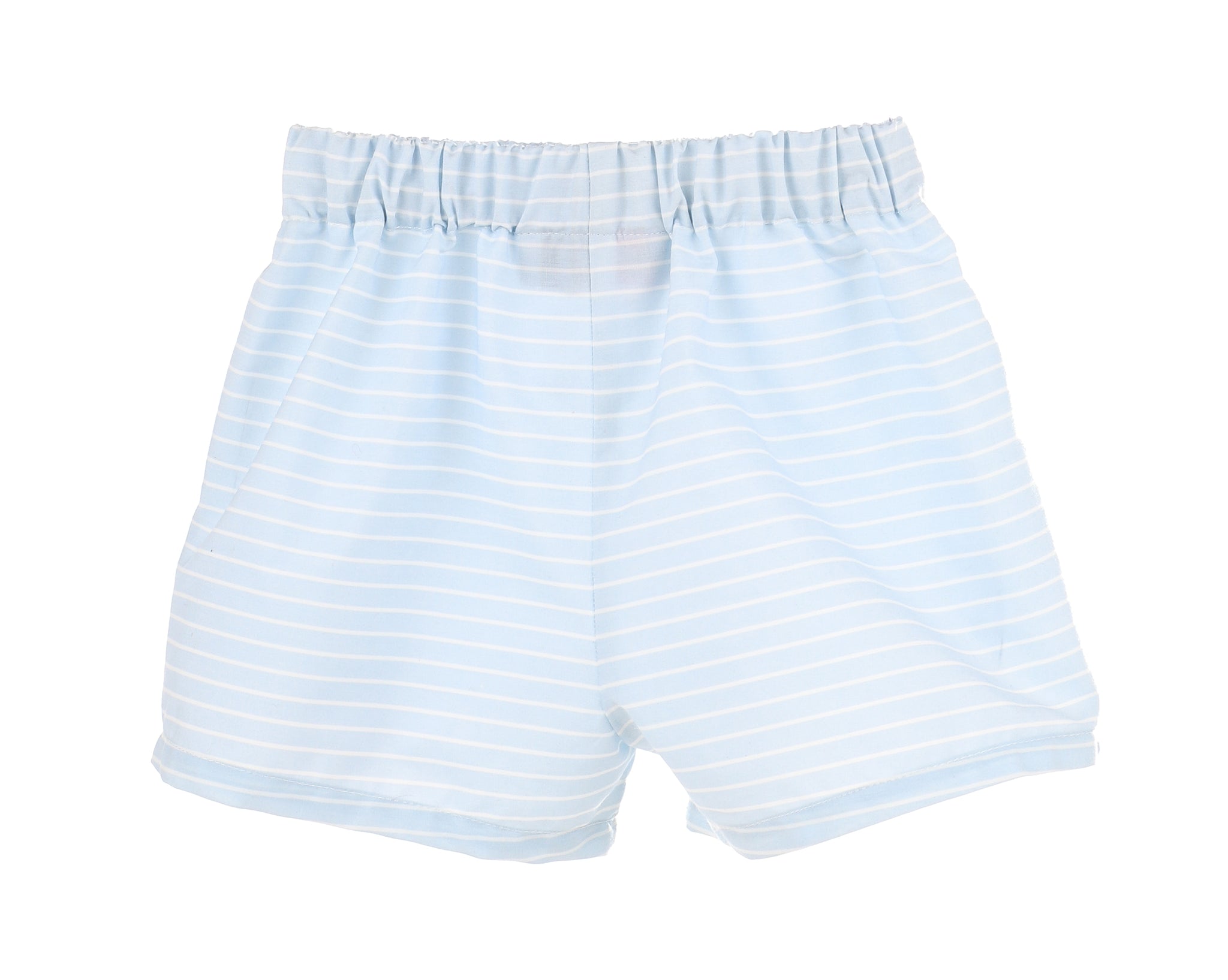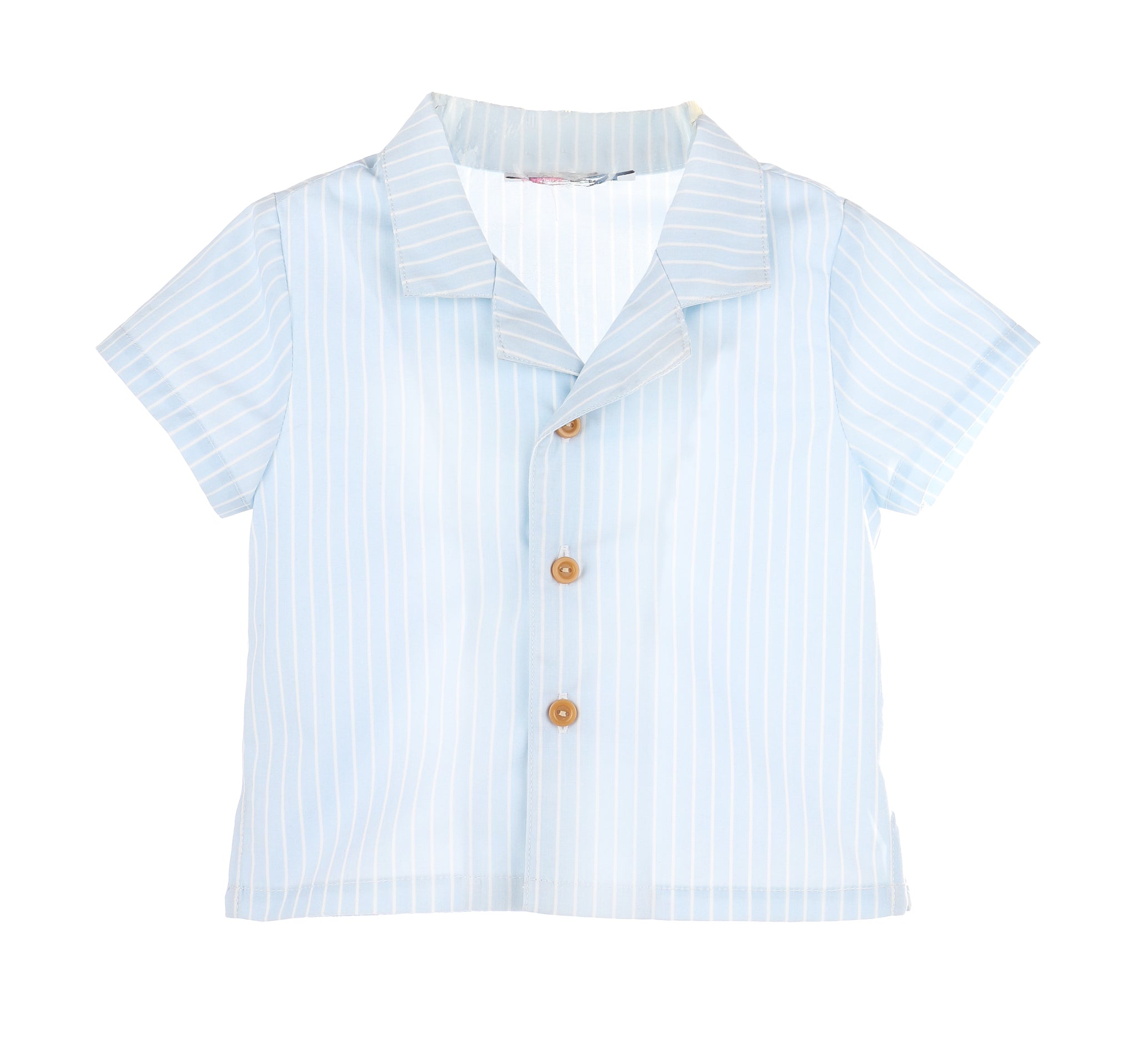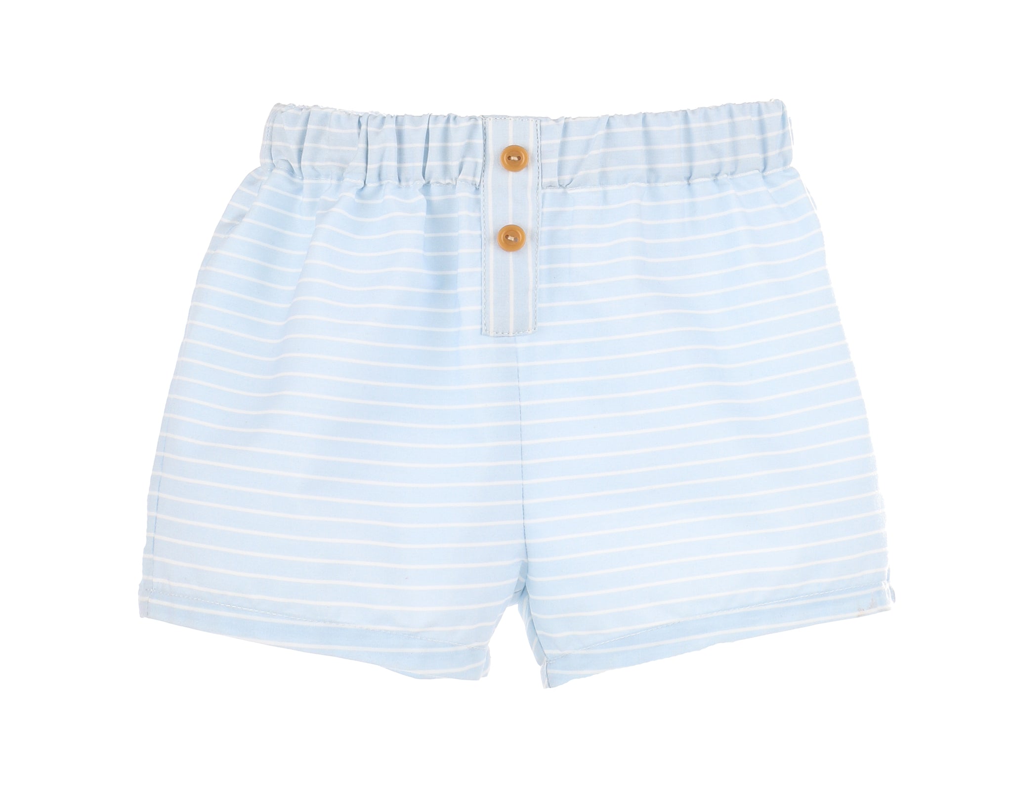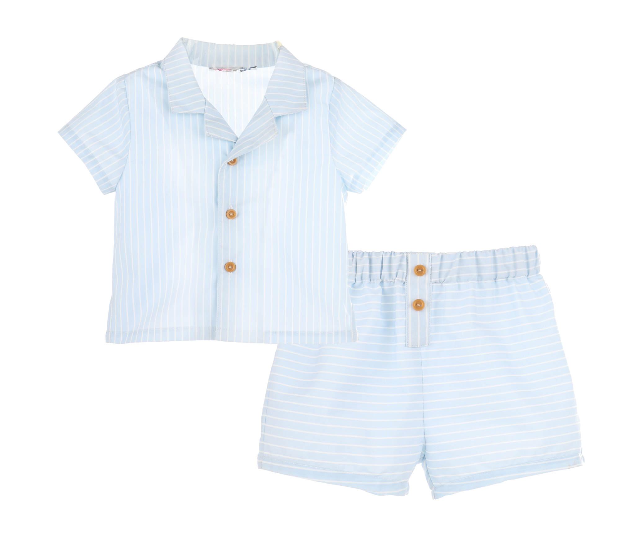 The newest boys set by Sophie and Lucas is as comfortable as it is cool. Pair the top and bottom together or wear them separately. Blue with a white pinstripe, elastic waistband and wooden buttons.